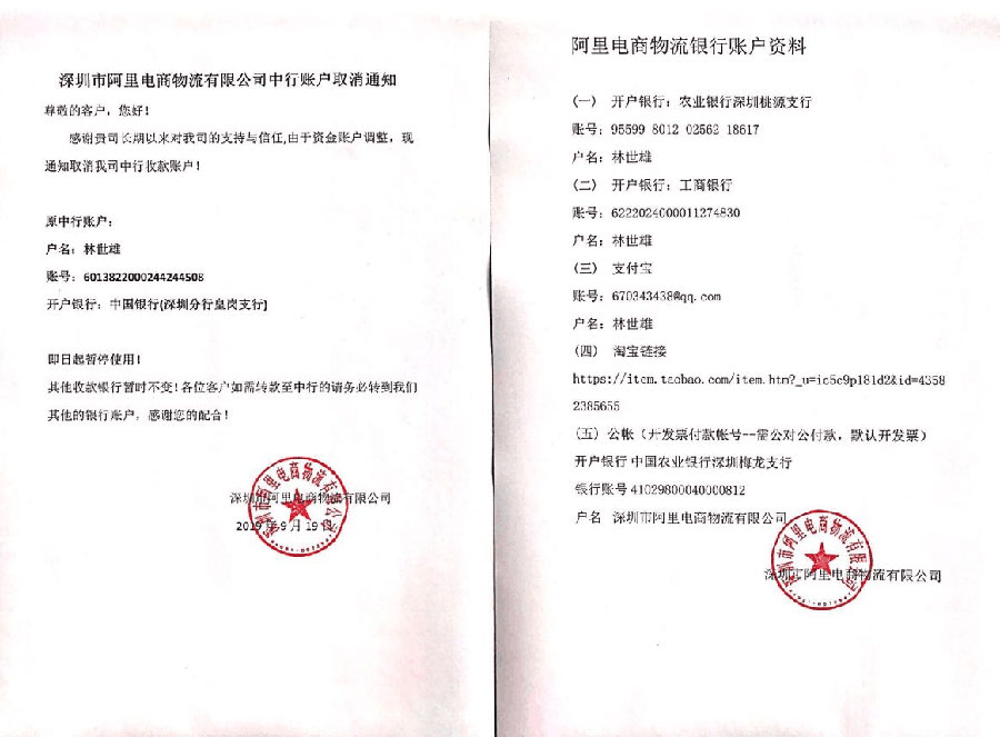 深圳市阿里電商物流有限公司中行賬戶取消通知