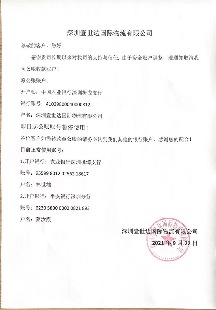 【壹世達】對公賬戶暫停使用通知