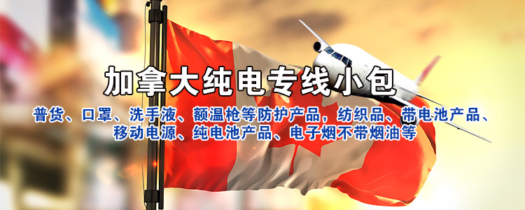加拿大純電專線小包為我司新增渠道,可接口罩、洗手液、額溫槍等防護(hù)產(chǎn)品,紡織品、帶電池產(chǎn)品、移動(dòng)電源、純電池產(chǎn)品、電子煙不帶煙油等,時(shí)效快,覆蓋整個(gè)加拿大,全程在線跟蹤包裹信息。