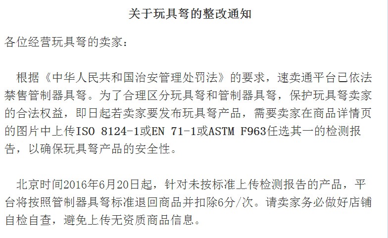 6月15日,速賣(mài)通就平臺(tái)對(duì)玩具弩整改發(fā)出通知,要求相關(guān)賣(mài)家在6月20號(hào)之前需要在商品詳情頁(yè)的圖片中上傳ISO 8124-1或EN 71-1或ASTM F963任選其一的檢測(cè)...[查看詳細(xì)]