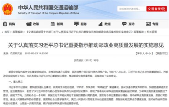 近日,交通運(yùn)輸部、國(guó)家郵政局等18個(gè)部門聯(lián)合印發(fā)《關(guān)于認(rèn)真落實(shí)習(xí)近平總書記重要指示推動(dòng)郵政業(yè)高質(zhì)量發(fā)展的實(shí)施意見》(簡(jiǎn)稱《意見》)。《意見》立足當(dāng)前,著眼長(zhǎng)遠(yuǎn),從全面深化改革、強(qiáng)化創(chuàng)新驅(qū)動(dòng)、加快結(jié)構(gòu)調(diào)整、提高服務(wù)質(zhì)量、推動(dòng)綠色發(fā)展、加強(qiáng)隊(duì)伍建設(shè)六個(gè)方面提出了18項(xiàng)重點(diǎn)任務(wù)。