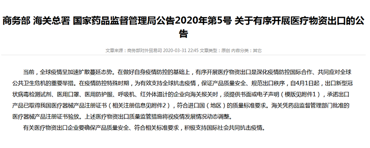 商務(wù)部 海關(guān)總署 國家藥品監(jiān)督管理局公告2020年第5號 關(guān)于有序開展醫(yī)療物資出口的公告
