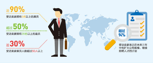 根據(jù)一項(xiàng)調(diào)查顯示,跨境電商企業(yè)中90%擁有5名以上雇員,超過50%擁有20名以上雇員,近30%的賣家雇員人數(shù)超過50人以上。這說明,擁有一定規(guī)模的賣家是跨境電商零售出口行業(yè)中的主流。這樣的賣家通常已經(jīng)具備一定的業(yè)務(wù)規(guī)模,也逐漸開始形成自己的優(yōu)勢品類,運(yùn)營管理的規(guī)范化程度也相對(duì)較高。這類賣家成為行業(yè)主流,意味著行業(yè)已經(jīng)走過了初生時(shí)的野蠻生長時(shí)期,進(jìn)入了更有質(zhì)量的成長階段。