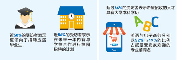 在接受eBay調(diào)查的賣家中,近50%的受訪者表示更傾向于招聘應(yīng)屆畢業(yè)生,有近56%的受訪者表示在未來一年內(nèi)有與學(xué)校合作進(jìn)行校園招聘的計(jì)劃。他們接受新生事物的速度快、更熟悉網(wǎng)絡(luò)時(shí)代的生活方式、可塑性更強(qiáng)、招聘成本也相對(duì)較低。因此,跨境電商零售出口產(chǎn)業(yè)為很多剛剛步出校門的學(xué)生提供了新的就業(yè)方向和發(fā)展機(jī)會(huì)。