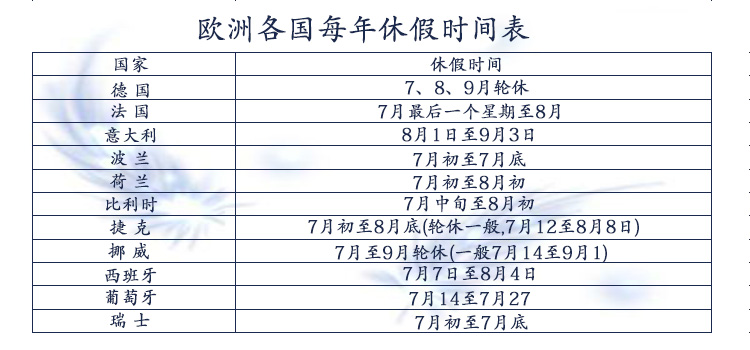 下面,我們就以歐洲為例,來(lái)看下歐洲主要各國(guó)每年的休假時(shí)間表,供大家參考。