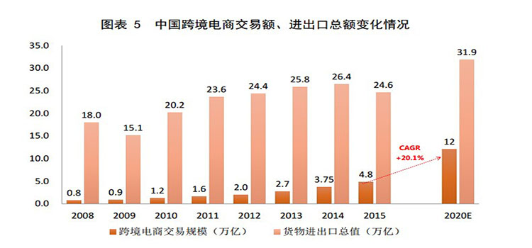 數(shù)據(jù)顯示,預(yù)計(jì)到2020年,中國(guó)跨境電商交易規(guī)模將達(dá)12萬(wàn)億元,占中國(guó)進(jìn)出口總額的約37.6%;中國(guó)跨境電商零售交易額將超過(guò)3.6萬(wàn)億元,年均增幅約37%,預(yù)計(jì)2020年跨境電商零售占比將超過(guò)30%。
