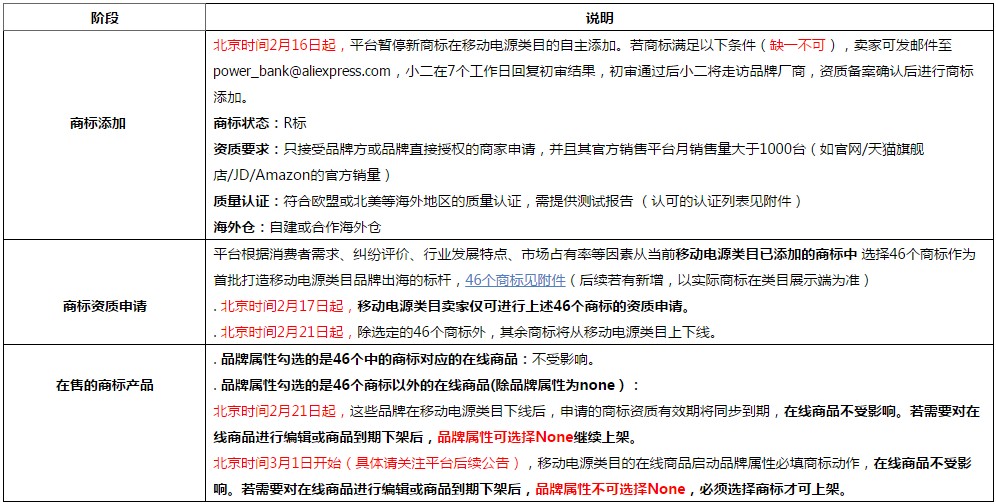 為此,速賣通平臺為了打造移動電源的品質(zhì)標(biāo)桿,優(yōu)先打造移動電源類目下品牌出海的標(biāo)桿,平臺將在2月16日起對移動電源類目的品牌進(jìn)行封閉管理。具體品牌管理內(nèi)容如下: