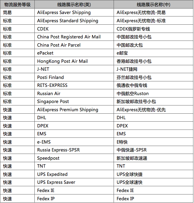 據(jù)速賣通通知了解到,接到俄羅斯郵政通知,部分國家郵政未與俄郵進行數(shù)據(jù)對接,郵件的處理時效無法得到保障,為保障俄羅斯買家的物流體驗和賣家利益,平臺將對發(fā)往俄羅斯國家未對接ITMATT的物流渠道進行管控。2017年07月31日(美國太平洋時間)起,發(fā)往俄羅斯的跨境訂單,標準類和快速類僅允許使用如下物流渠道發(fā)貨。
