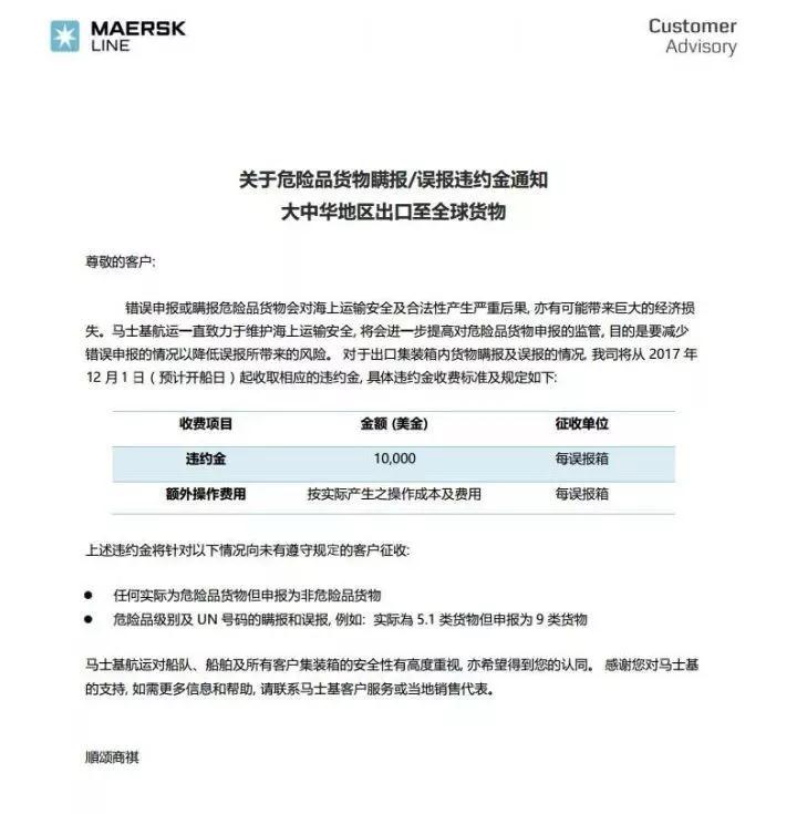 通知中寫明,對集裝箱內(nèi)危險(xiǎn)品瞞報(bào),錯誤申報(bào)貨物的危險(xiǎn)性質(zhì)的客戶,收取違約金每自然箱10000美金;此外,每個(gè)誤報(bào)箱還將按照實(shí)際操作所產(chǎn)生的費(fèi)用和成本,收取額外的補(bǔ)貼費(fèi)用;此舉旨在共同創(chuàng)建和諧、安全的貨物運(yùn)輸環(huán)境。 12月起危險(xiǎn)品管控升級!馬士基和薩非航運(yùn)將對瞞報(bào)誤報(bào)者征收違約金